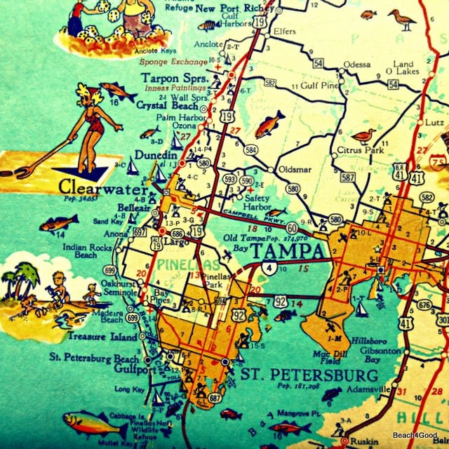 Clearwater Tampa Florida Beach Map Print Beach House Decor Etsy