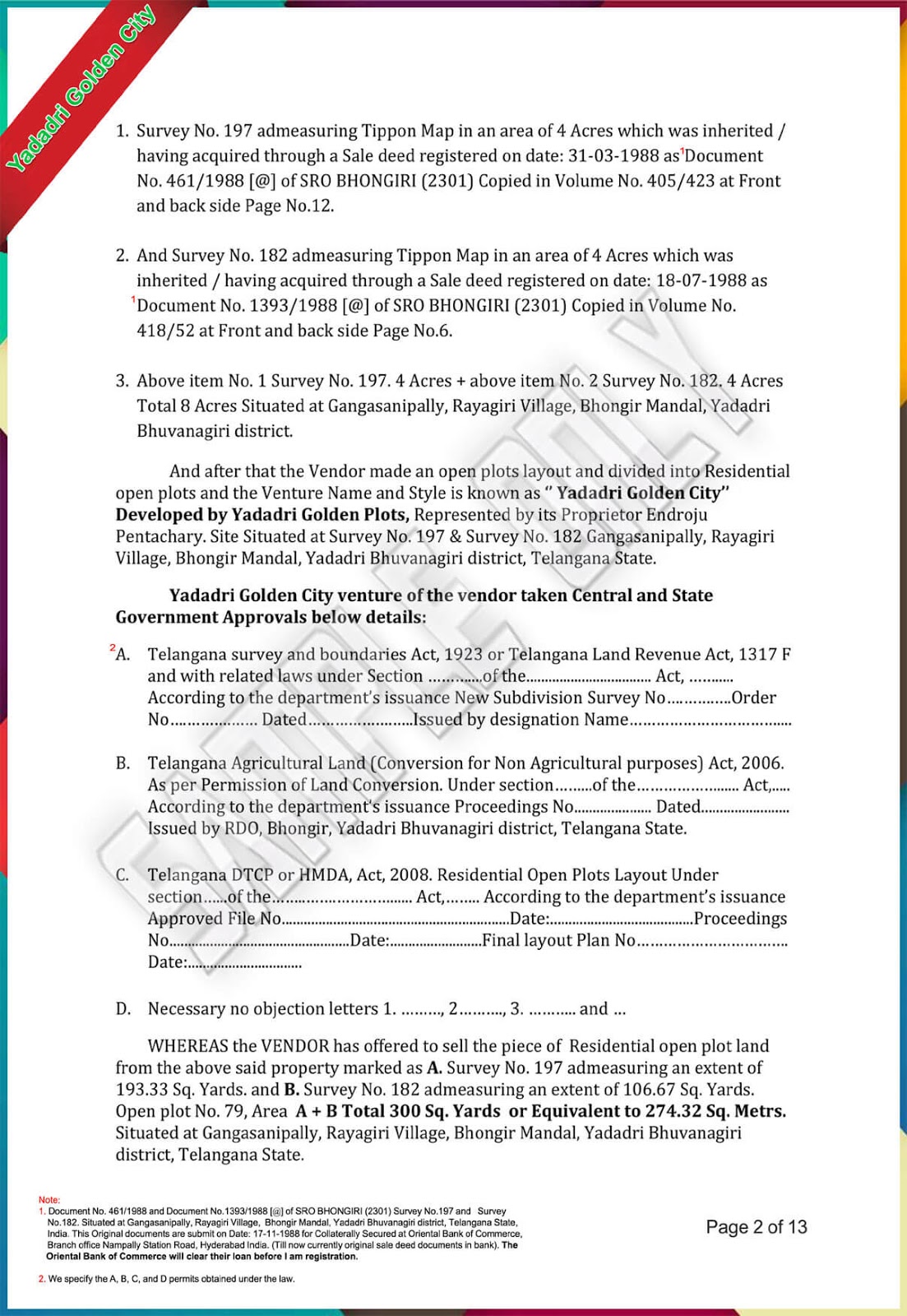 Yadadri Golden City: dtcp layout plots sale deed sample